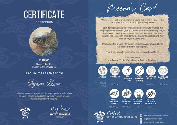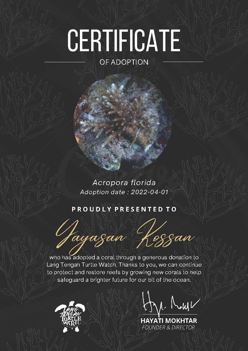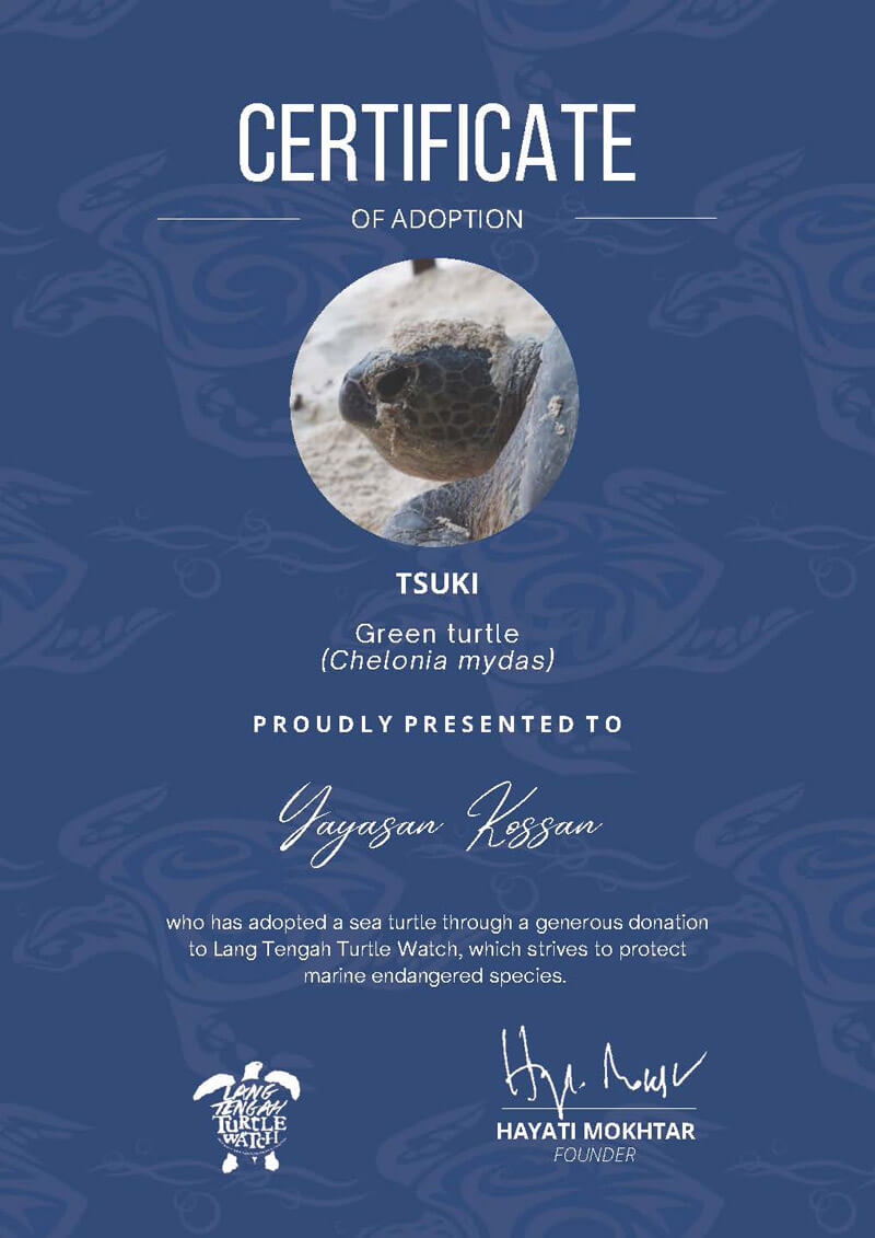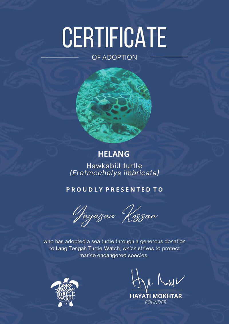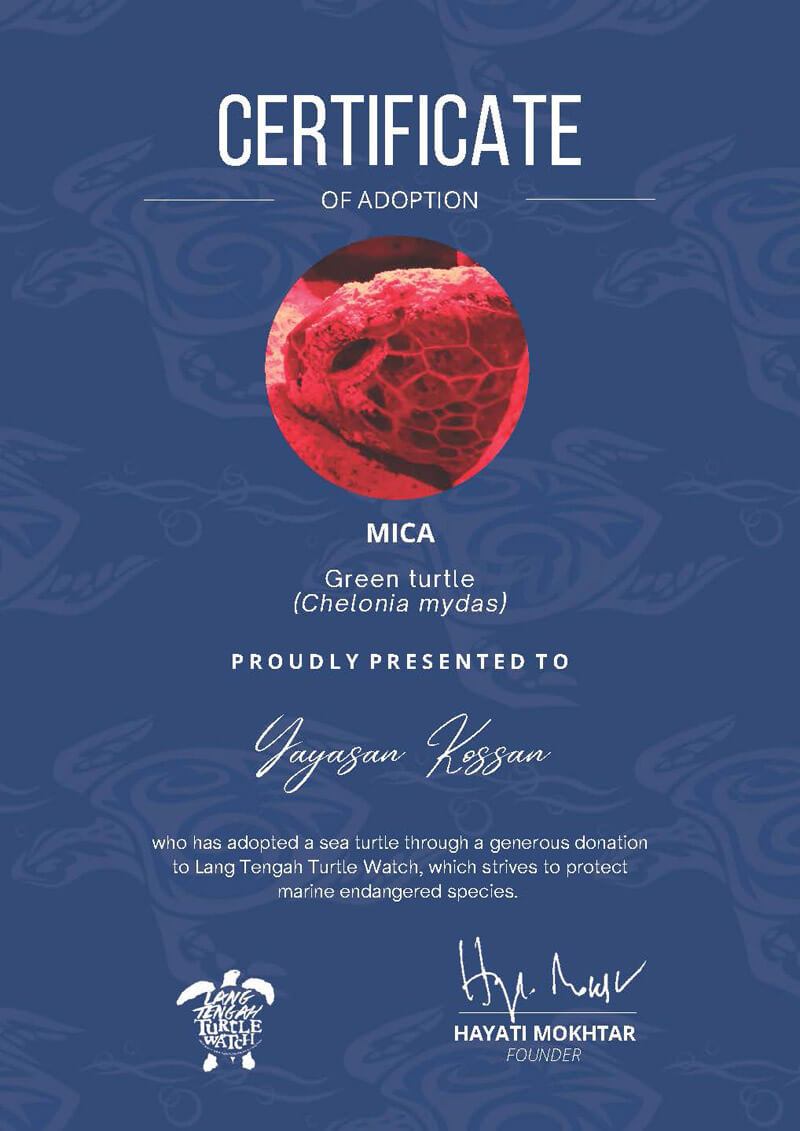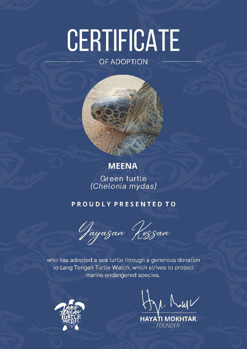 Kami dengan berbesar hati ingin mengumumkan bahawa Yayasan Kossan telah menaja 8 ekor penyu hijau, 2 penyu sisik, 5 sarang penyu dan 10 karang dengan kerjasama bersama Lang Tengah Turtle Watch (LTTW).