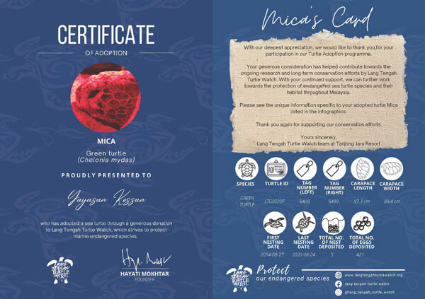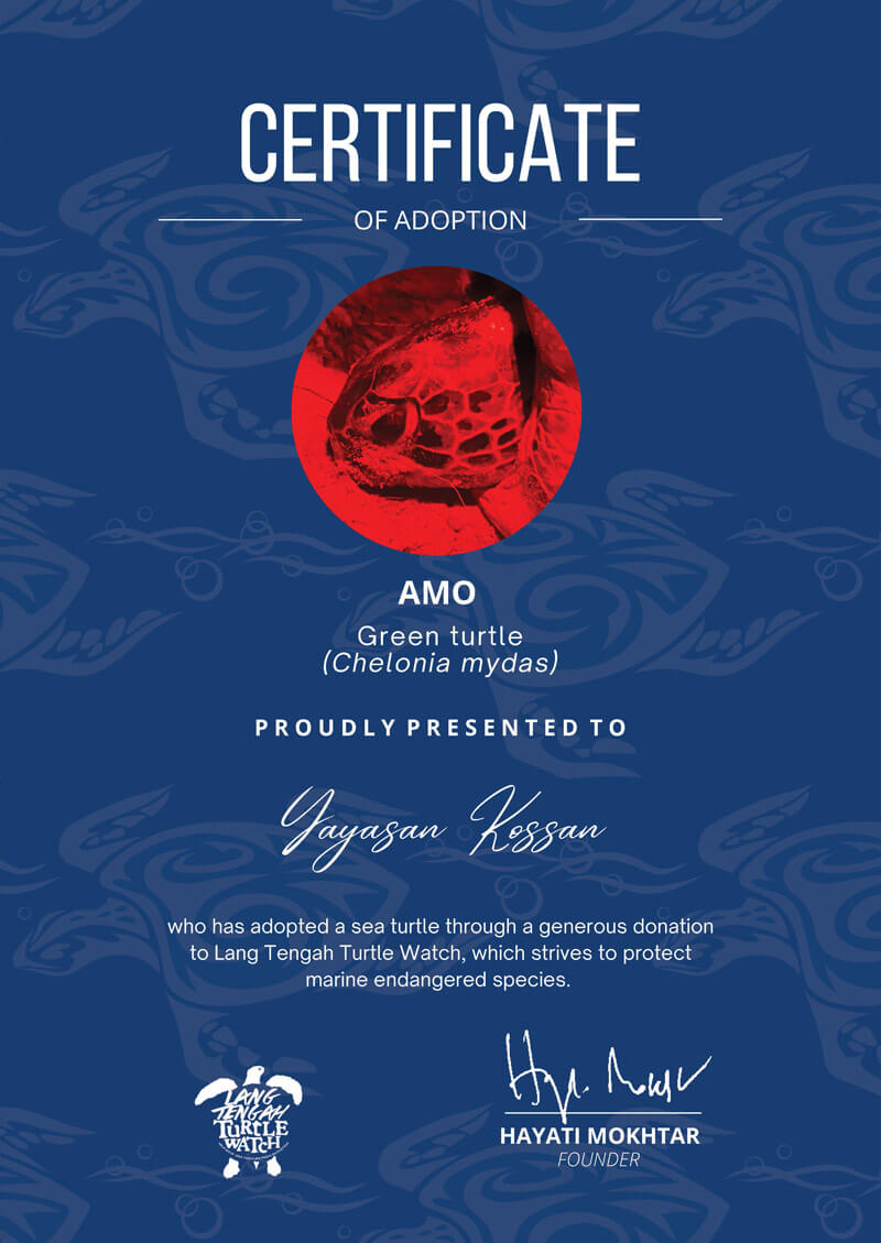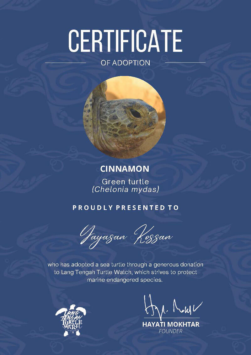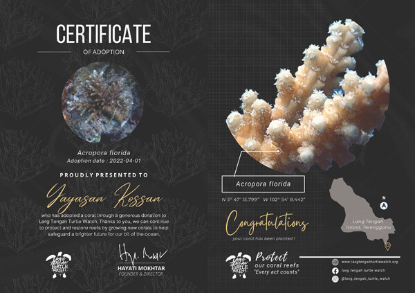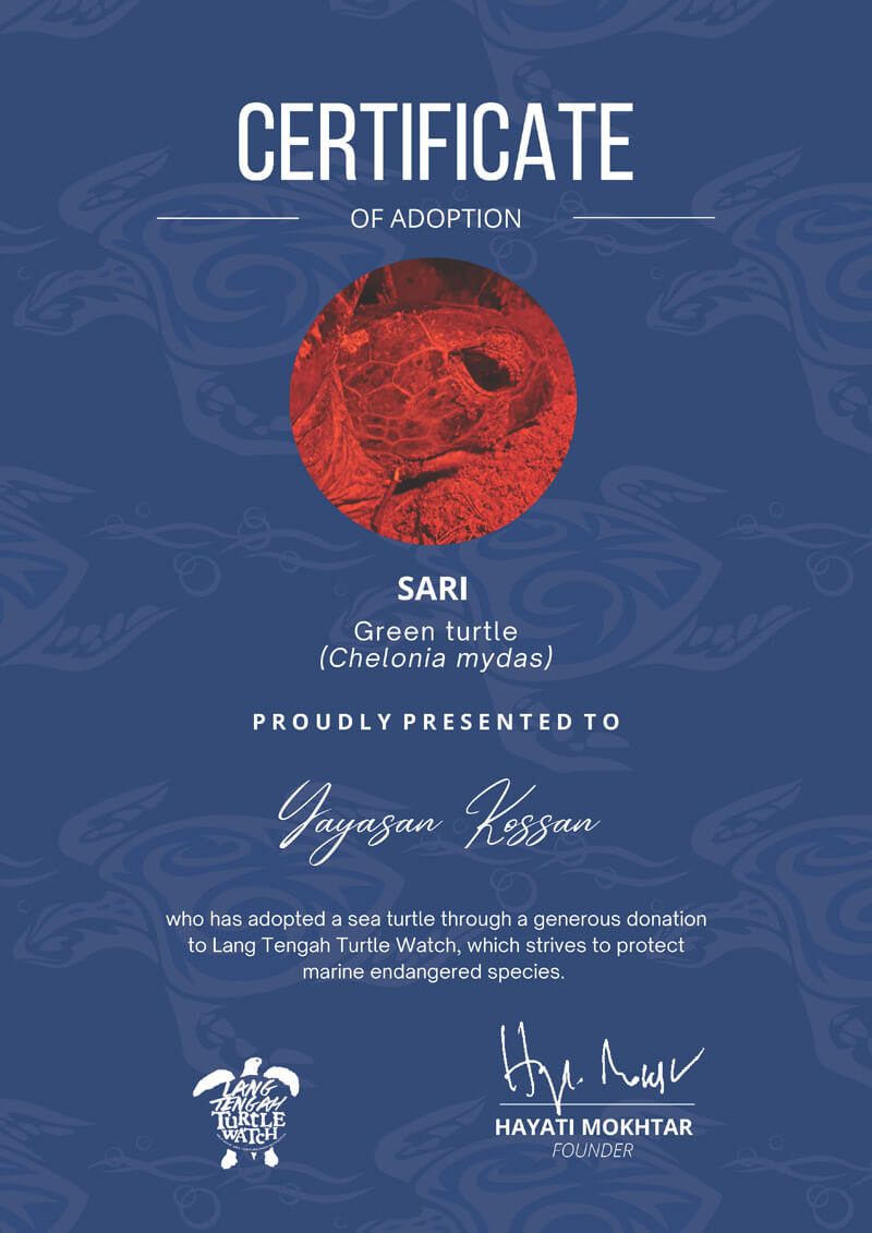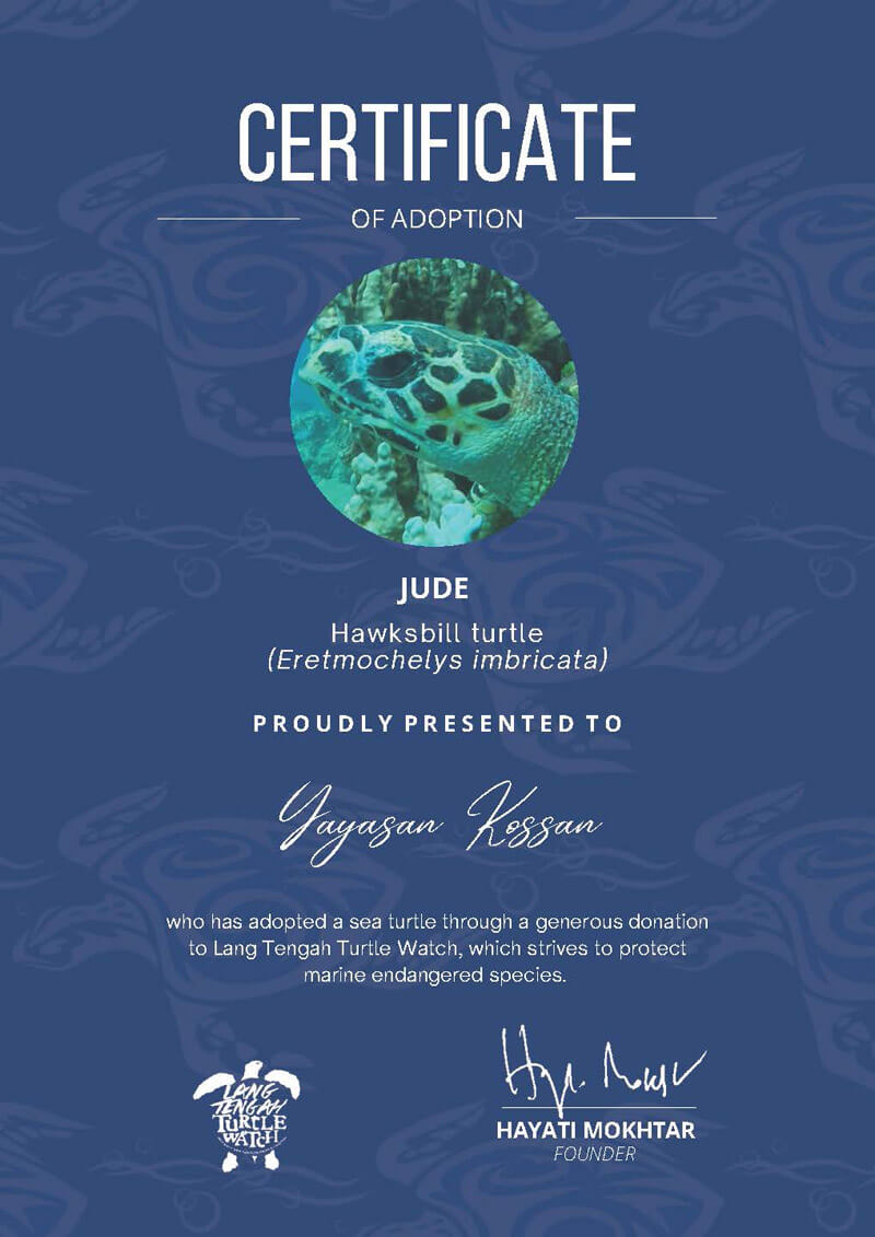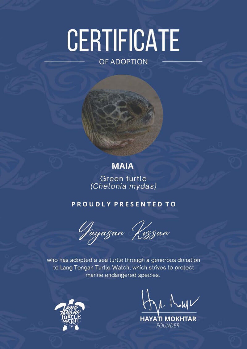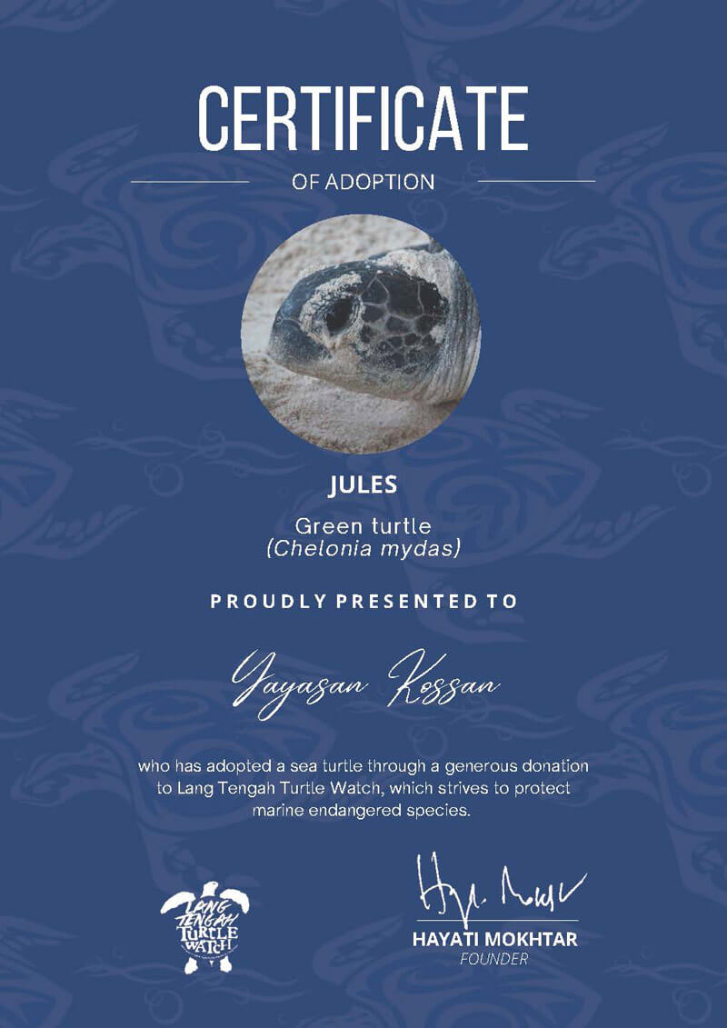 We are proud to announce that Yayasan Kossan has adopted 8 green sea turtles, 2 Hawksbill turtles, 5 turtle nests, and 10 corals in collaboration with the Lang Tengah Turtle Watch (LTTW).